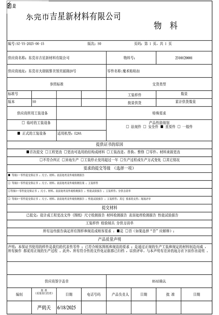 东莞市吉星新材料有限公司承认书